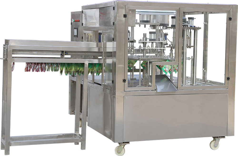 本機(jī)器適用于自立袋自動(dòng)灌裝封口。用于飲料,酸奶,果凍,,純凈水等包裝。